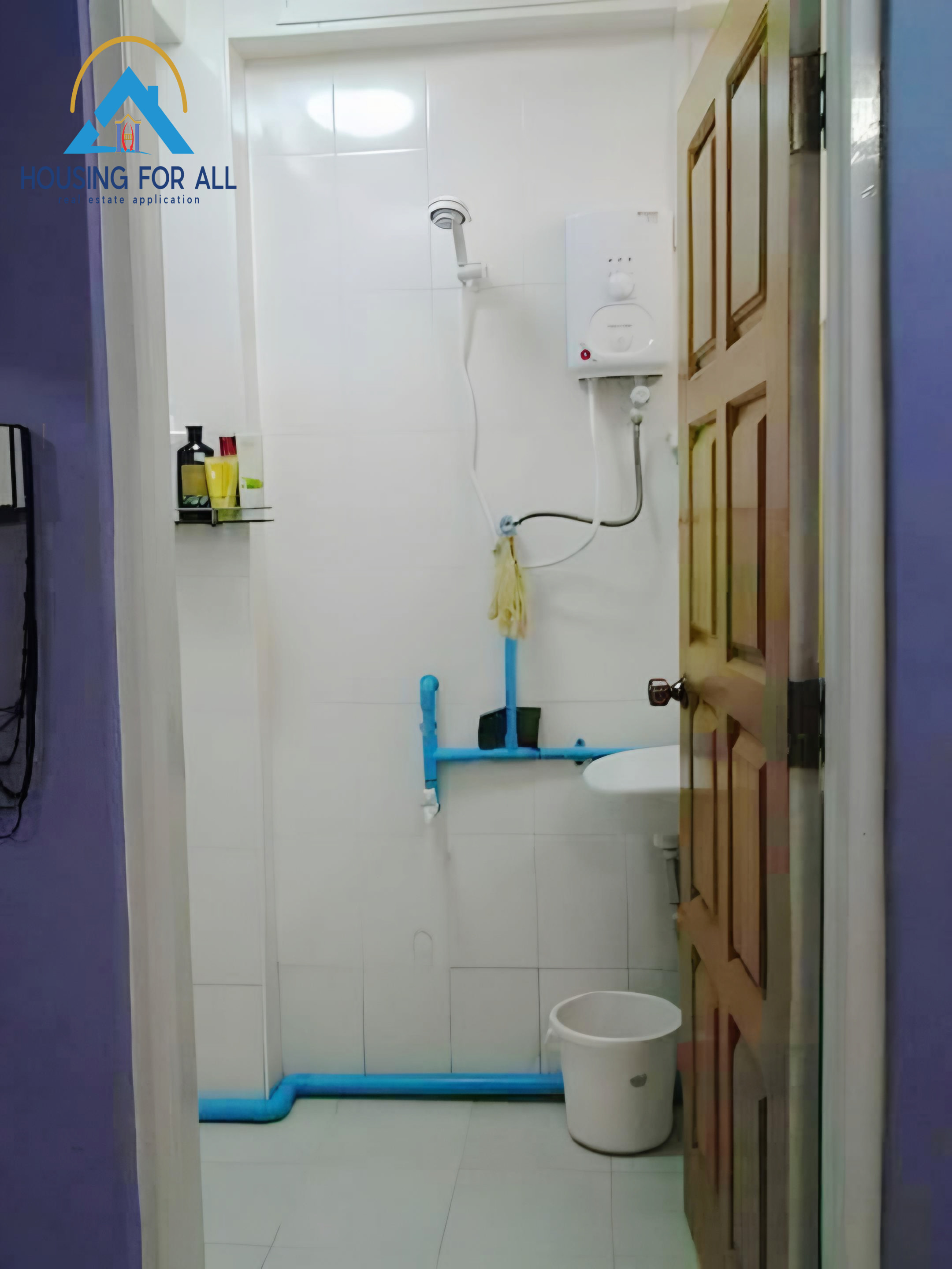 - ရေချိုးခန်းအိမ်သာ ကြွေပြားကြမ်းခင်းခင်းပီး၊ဘေးနံရံအပြည့် ကြွေပြားကပ်ပြီး