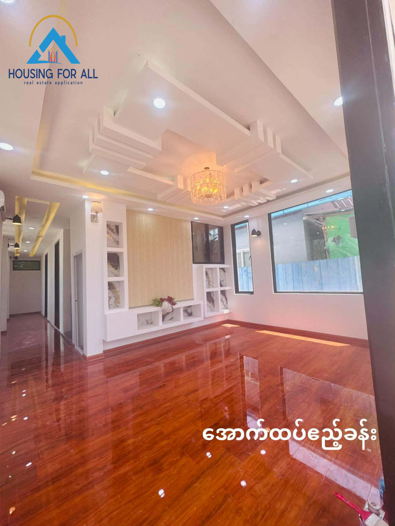 အောက်ထပ် - ဧည့်ခန်း ( ၁)ခန်း / လှေကားခွင်အောက်ကို စတိုခန်း အခန်း ငယ်ပြင်ဆင်ပေးပြီး